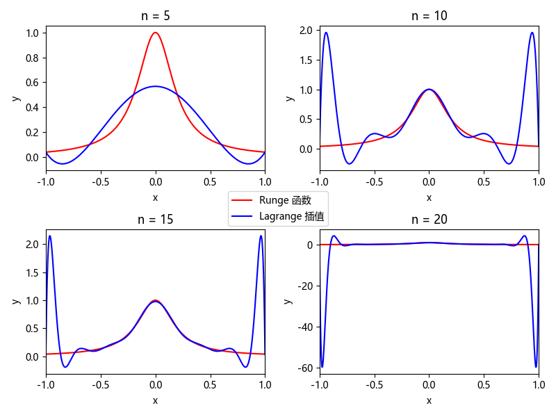 一般情况下, 多项式的次数越多, 需要的数据就越多, 而预测也就越准确. 但也存在插值次数越高, 插值结果越偏离原函数的现象, 特别常发生在区间的端点处, 称为 Runge 现象[1].